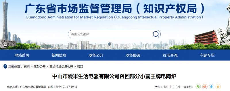 - 日前,中山市愛米生活電器有限公司按照《消費品召回管理暫行規定》的要求,主動向廣東省市場監督管理局報告了召回計劃,將自即日起,召回2020年12月18日制造的部分小霸王牌電陶爐,型號AE-1203B
