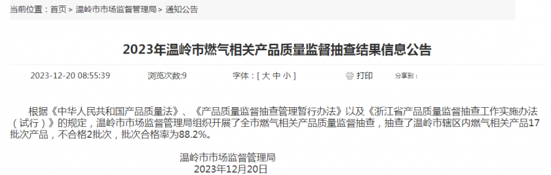- 2023年浙江省溫嶺市燃?xì)庀嚓P(guān)產(chǎn)品質(zhì)量監(jiān)督抽查結(jié)果信息公告