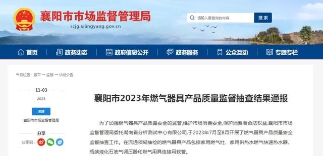 - 湖北省襄陽市通報2023年燃氣器具產品質量監督抽查結果