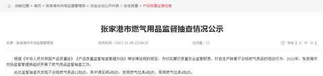- 2023年11月9日,江蘇省張家港市市場監督管理局公示張家港市燃氣用品監督抽查情況。 根據《中華人民共和國產品質量法》《產品質量監督抽查管理辦法》等法律法規的規定,為切實履行質量安
