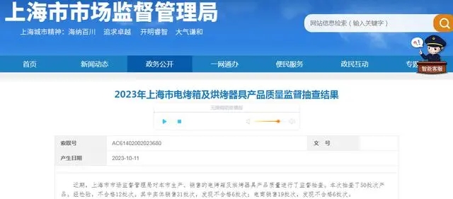 - 上海市市場監管局抽查電烤箱及烘烤器具產品50批次 不合格12批次