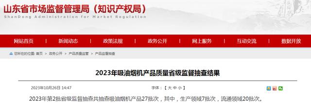 - 山東省市場監督管理局抽查吸油煙機產品27批次 4批次不合格