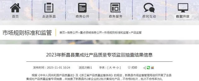 - 2023年浙江省新昌縣集成灶產品質量專項監督抽查結果