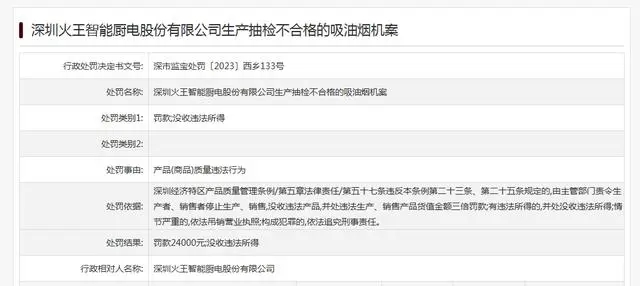 - 深圳火王智能廚電股份有限公司因產(chǎn)品質(zhì)量違法行為被罰2.4萬