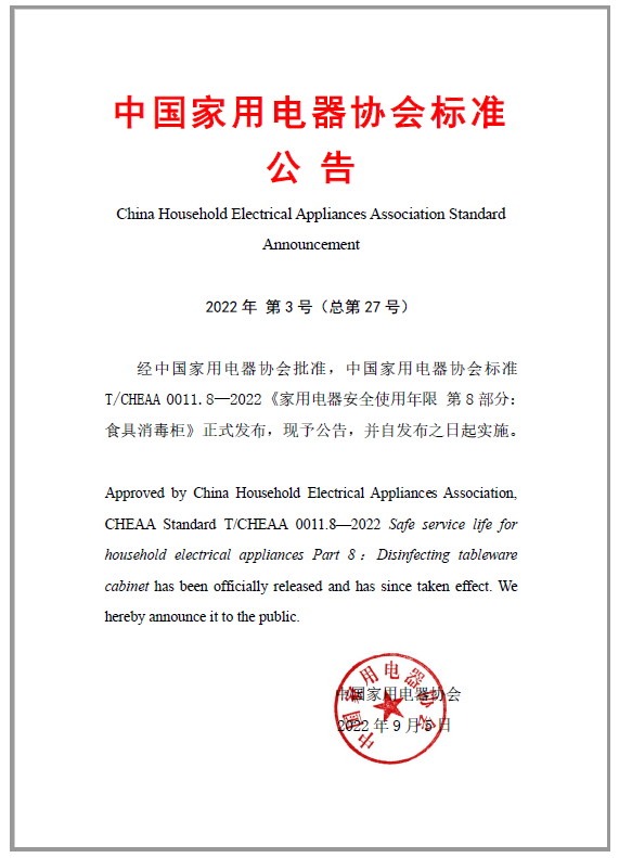 - 中國家用電器協會標準T/CHEAA 0011.8—2022 《家用電器安全使用年限 第8部分:食具消毒柜》正式發布