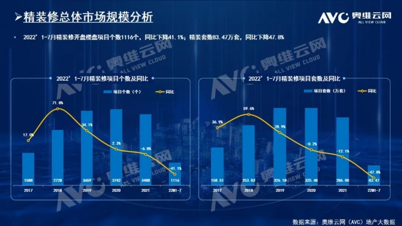 - 整體大盤精裝市場不容樂觀,7月環比回歸下降 2022年房地產整體各項指標低位運行,相關政策成效尚未顯現。據國家統計局發布2022年1-7月,全國房地產開發投資79462億元,同比下降6.4%;住宅投