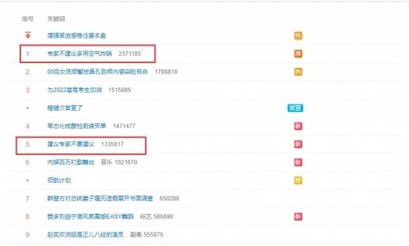 - 今天(5月24日) 專家建議又上熱搜了 一開始 專家建議:不要多用空氣炸鍋 登上了微博熱搜榜第一的位置 不過很快 前幾天登頂熱搜的 “建議專家不要建議”