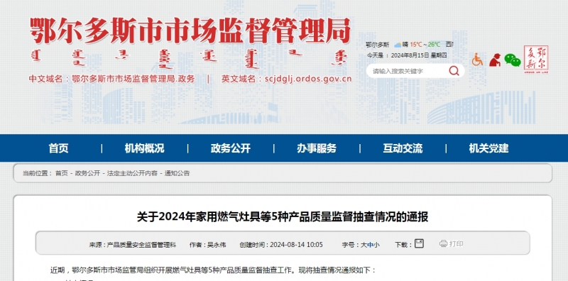 - 內蒙古鄂爾多斯市市場監管局通報2024年家用燃氣灶具等5種產品質量監督抽查情況