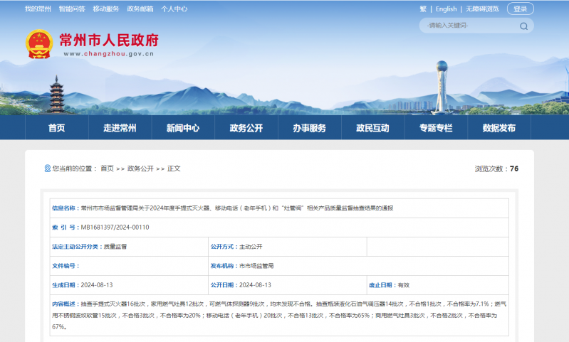 - 【江蘇省】2024年常州市家用燃氣灶具產品質量監督抽查結果公布