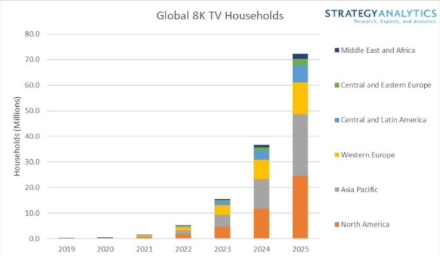 但是日前有研究機構Strategy Analytics最新報告稱,未來幾年,全球范圍內采用8K電視的家庭數量開始持續增長,到2025年將達到7200萬戶。