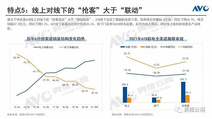 618線上對線下的“搶客效應”大于“聯動效應”。618線下出現了量額的全面下滑,據奧維云網(AVC)推總,618四周線下銷量86.8萬臺,同比下降26.9%,推總銷額47.8億元,同比下降5.2%。6月線下渠道占比預計將下降到25.4%。