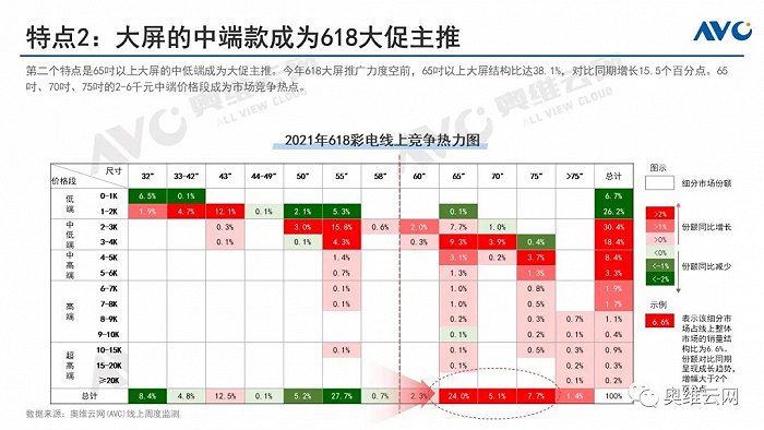 今年618大屏推廣力度空前,65吋以上大屏結構比達38.1%,對比同期增長15.5個百分點。65吋、70吋、75吋的2-6千元中端價格段成為市場競爭熱點。