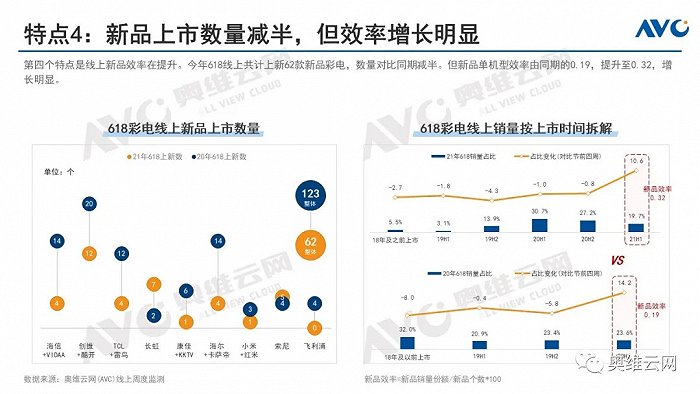 線上新品效率在提升。今年618線上共計上新62款新品彩電,數量對比同期減半,但新品單機型效率由同期的0.19,提升至0.32,增長明顯。