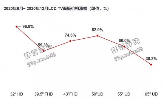 受蔓延全球的新冠疫情及各方面因素影響,全球的芯片、面板等產品在近一年左右時間內價格普遍上漲。根據群智咨詢(Sigmaintell)數據顯示,自2020年第三季度開始,全球LCDTV面板迎來了近十年來時間最長,漲幅最大的上漲周期。截至6月上旬,主流尺寸的液晶面板均有不同程度的上漲,43/50/55英寸面板同比漲幅普遍突破100%,32英寸同比漲幅甚至接近200%。除了面板之外,全球眾多加工廠受疫情影響停工導致芯片價格漲勢兇猛,,甚至無貨可供。高盛指出,全球范圍內多達169 個行業在不同程度上受到芯片短缺的打擊,電視機顯然也在其中。