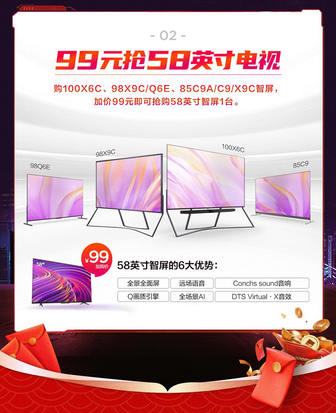 如果你喜歡超大屏電視帶來的沉浸感的話,那么100英寸X6C、98英寸X9C/Q6E、85英寸C9A/C9/X9C這些大尺寸機(jī)型一定非常適合你,同樣加99元即可搶購58英寸智能電視一臺!屆時(shí)客廳一臺98英寸的超大屏電視全家人一起看,在家就能體驗(yàn)私人影院的影音體驗(yàn)嗎,親戚來拜年也倍有面子,58英寸電視房子臥室看看球賽還不是美滋滋。