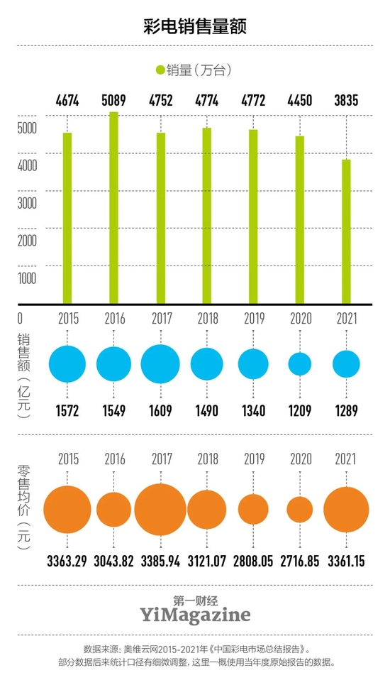 誰也不想做利潤越來越低的生意,何況國內(nèi)電視市場還面臨需求總量不斷縮水的壓力。需要添購彩電的適齡人口數(shù)量在下降,房地產(chǎn)調(diào)控導(dǎo)致?lián)Q購的需求也受到一定抑制,這都導(dǎo)致國內(nèi)彩電銷量從2016年沖破5000萬臺大關(guān)之后便掉頭向下,到2021年只賣出3800多萬臺,比疫情暴發(fā)的2020年還要少600多萬臺。