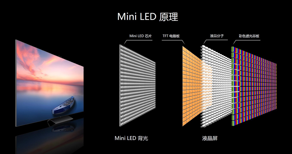 Mini LED是LCD屏幕多種背光技術中的一種,過去的屏幕背光是一整塊來實現,要亮全亮、要關全關,就導致了對比度非常低。而Mini LED則將整塊背光改用很多很小的LED燈珠作為背光源,并可以提供更多的分區控光,這樣需要亮的地方就開燈,需要暗的部分就調暗甚至是關掉,讓屏幕成像質量有了長足的進步。