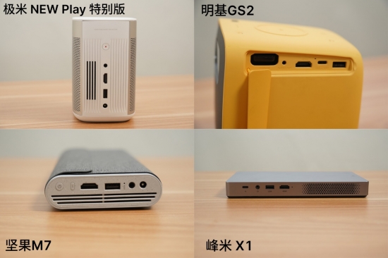 從外觀設計的美觀角度來看,四款投影儀本體堅果M7相對更有質感一些,無論是機身的花崗巖紋理還是仿皮質的保護套看起來都很顯檔次;峰米X1整體凸顯科技感,棱角分明的機身線條和滑蓋開機功能都是很討好極客的設計;極米 NEW Play特別版更像是智能音箱,做工和質感可圈可點;明基GS2通體被黃色硅膠外殼包裹,看起來相當可愛,而且也因此具備了防水防塵防摔的三防功能,特別適合戶外使用,美中不足之處是外殼容易被蹭臟。