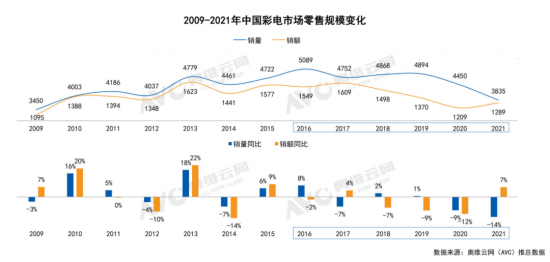 拋開供應鏈的關系,中國市場的特殊性同樣也不可忽視。同樣是根據奧維數據,中國彩電的市場已經連續4年下跌。在2021年,由于種種因素的共同作用,彩電市場的銷量失守4000萬臺大關,整體的市場規模已經退回到了2009年的狀態。