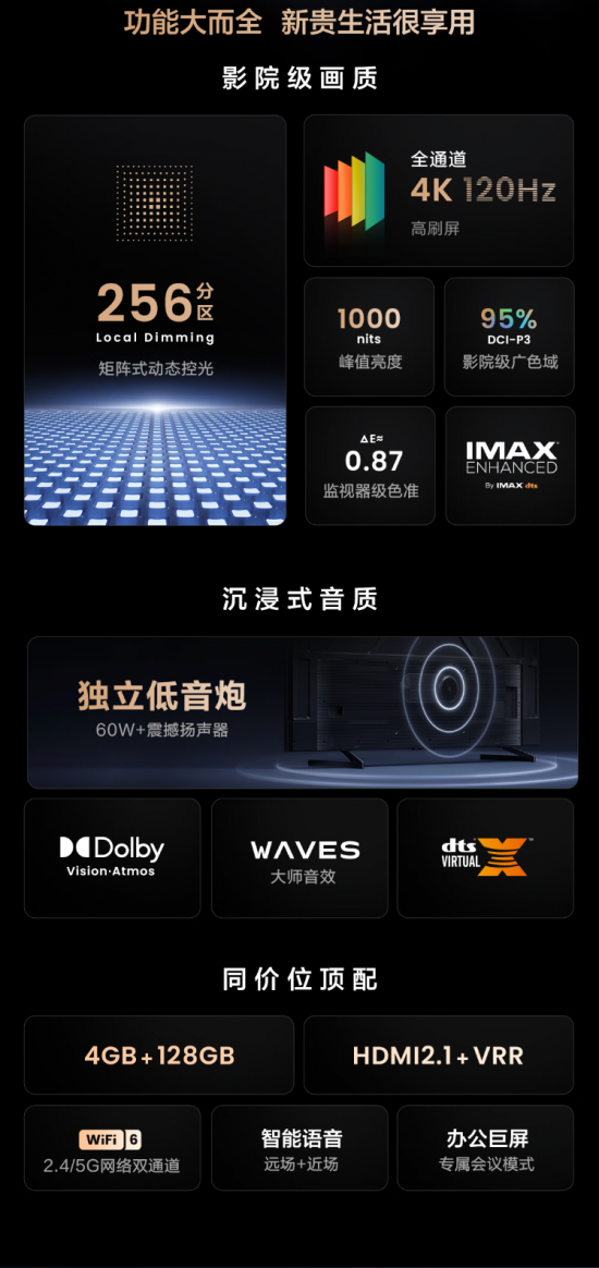 10月底,海信旗下年輕品牌Vidda發布100英寸電視Vidda Z100,同時提出“世界杯就要用大屏看”的消費理念。Vidda Z100兼具高品質和親民價格,并且對用戶提供免費安裝服務,解決了巨屏電視購買之后安裝難的后顧之憂。其采用金屬機身和金屬底座,配備了 256 背光分區,峰值亮度達到 1000nits,色域方面達到 95% DCI-P3 影院級廣色域,色準達到 △ E≈0.87。同時,Vidda Z100也具備全通道4K 120Hz高刷新率顯示能力,配備低音炮,并通過了IMAX認證,堪稱客廳中的巨屏影院。