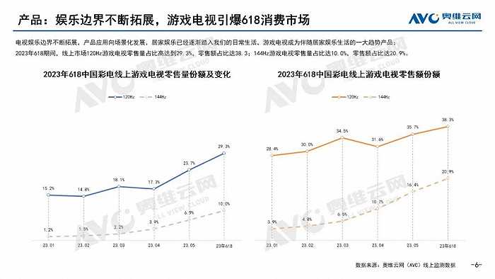 120Hz及以上屏幕刷新率的游戲電視,自2021年開始發力,2022年成長為行業場景化爆品,今年618促銷期間,游戲電視延續大漲勢頭。據奧維云網(AVC)線上監測數據顯示,零售量占比達到40.3%,較去年同期增長23個百分點;零售額占比達到61.0%,較去年同期增長27.4個百分點。并且高刷功能的布局也在向著更高邁進,144Hz的游戲電視已成規模。戳→奧維數據羅盤