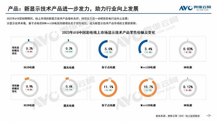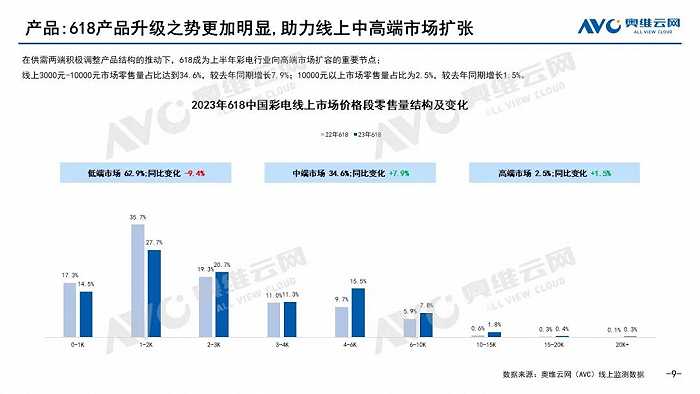 在供需兩端積極調整產品結構的推動下,618促銷期間中國彩電線上中高端市場迎來增長。據奧維云網(AVC)線上監測數據顯示,618期間線上3000元-10000元市場零售量占比達到34.6%,較去年同期增長7.9%;10000元以上市場零售量占比為2.5%,較去年同期增長1.5%。戳→奧維數據羅盤