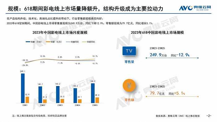彩電作為成熟的家電品類,市場趨于飽和,規模主要來自于存量換新需求。今年的618大促期間,量降額升成為中國彩電行業的主基調。據奧維云網(AVC)線上推總數據顯示,2023年618期間(23W23-23W25:2023.05.29-2023.06.18),中國彩電線上市場零售量規模為249.9萬臺,同比下降12.9%;零售額規模為79.7億元,同比增長5.1%。
