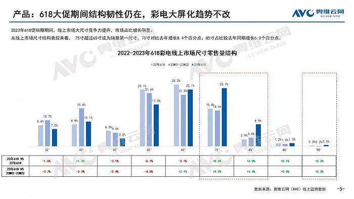 在更新換代、消費升級的背景下,大屏電視憑借更好的視聽享受優勢受到消費者喜愛。據奧維云網(AVC)線上監測數據顯示,今年618促銷期間,中國彩電線上市場75英寸及以上尺寸產品零售量占比達到34.9%,較去年同期增長15個百分點,75英寸則以23.7%的零售量占比成為第一大尺寸。戳→奧維數據羅盤