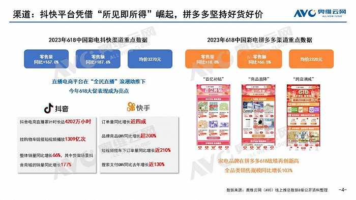 從今年618促銷期間線上彩電細分渠道來看,新興電商成為618線上彩電市場的一大亮點。在直播浪潮的助推下,線上流量向抖/快平臺聚集,在618促銷期間抖/快平臺邁入高速發展期,零售量規模同比增長167.0%,零售額規模同比增長187.6%。拼多多零售量規模同比增長18.8%,并且在品牌的布局、推動下,今年618拼多多平臺的彩電產品結構迎來升級,帶動了零售額大幅提升,同比增長66.5%。