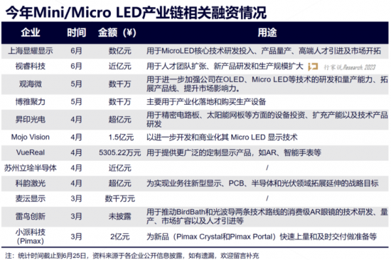 今年以來,上述發展勢頭不減。如上海顯耀顯示科技JBD、小派科技、Mojo Vvision、VueReal等知名Micro LED企業獲得如阿里、三星、比亞迪、吉利等知名企業的巨額融資,用于MicroLED核心技術研發投入、產品量產等。