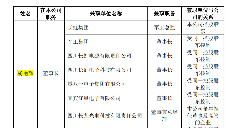 值得一提的是,華豐科技的董事長楊艷輝身兼數職,不僅是長虹集團軍工總監,還是軍工集團董事長、四川長虹電源有限責任公司董事長、四川長虹電子科技有限公司董事長、零八一電子集團有限公司董事長以及宜賓紅星電子有限公司董事長。