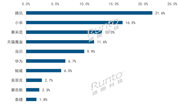 根據洛圖科技(RUNTO)線上監測數據顯示,2023年上半年,中國智能盒子線上零售市場TOP5品牌為騰訊、小米、賽米尼、天貓魔盒和當貝。