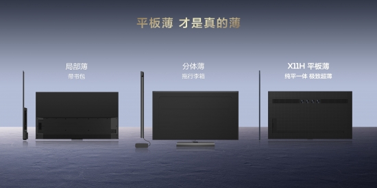 外觀方面,得益于領(lǐng)先行業(yè)的微距OD2和純平一體的領(lǐng)先工藝,X11H電視整機做到了極致超薄,并真正體現(xiàn)了“平板薄才是真的薄”,沒有“小書包”,沒有“行李箱”,視覺上更加大氣美觀。再結(jié)合如萬象星河的背部星空紋理、經(jīng)典邊框分層設(shè)計等,實現(xiàn)了無縫貼墻,高級感也瞬間拉滿,彷佛像一件精美的藝術(shù)品。