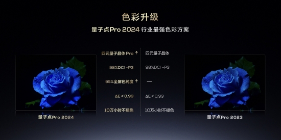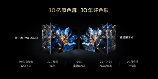 色彩顯示層面,Q9K的表現(xiàn)遠超行業(yè)水平。它搭載了一般只在高端旗艦產(chǎn)品上才會有的量子點技術(shù),而且還是升級版的量子點Pro 2024,采用全新四元量子晶體Pro,不僅實現(xiàn)在DCI-P3標(biāo)準(zhǔn)下的98%高色域值,還擁有95%的超高全屏色純度,色準(zhǔn)ΔE<0.99,壽命也能達到10萬小時不褪色,做到真正的10億原色屏,10年好色彩。