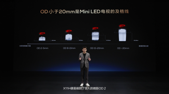在OD方面,X11H做到了微距OD,是目前市面上最小的Mini LED電視OD。OD其實是背光燈板到擴散板之間的距離。OD值越小,光暈控制能力就越強,電視越薄。當(dāng)OD小于20mm,才能較好控制光暈;當(dāng)OD大于20mm,光暈是很難控制的??梢哉f,Mini LED電視的OD大于20mm都是耍流氓。而X11H把OD距離控制在2mm,這意味著X11H不僅光暈控制更加游刃有余,能真實呈現(xiàn)深邃細膩、顆顆分明的繁星夜景,也能打造出極致超薄的機身。