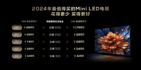而萬眾矚目的2024畫質(zhì)天花板TCL X11H則提供了85吋、98吋共兩個尺寸選擇,85吋首發(fā)預(yù)約驚喜價27999元,98吋首發(fā)預(yù)約驚喜價44999元,3月6日在全渠道正式開啟預(yù)售。Q9K的定價則讓人感受到什么叫質(zhì)價比拉滿,相比Q10G Pro配置上做到了6大升級的同時,價格還實現(xiàn)了全面降級,預(yù)售期間,98吋、85吋、75吋、65吋、55吋實際到手價分別為:17999元、8999元、6999元、5499元和4199元。Q9K全網(wǎng)預(yù)售也是3月6日開啟,正式開售是3月14日晚8點。