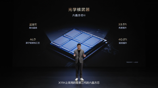 在發(fā)光芯片上,X11H采用第二代六晶方芯,擁有6個發(fā)光點和藍寶石高光晶底,能最大化激活六晶方芯發(fā)光潛能,實現(xiàn)更高的發(fā)光效率,帶來33.5%的亮度提升和40.2%的能效提升。