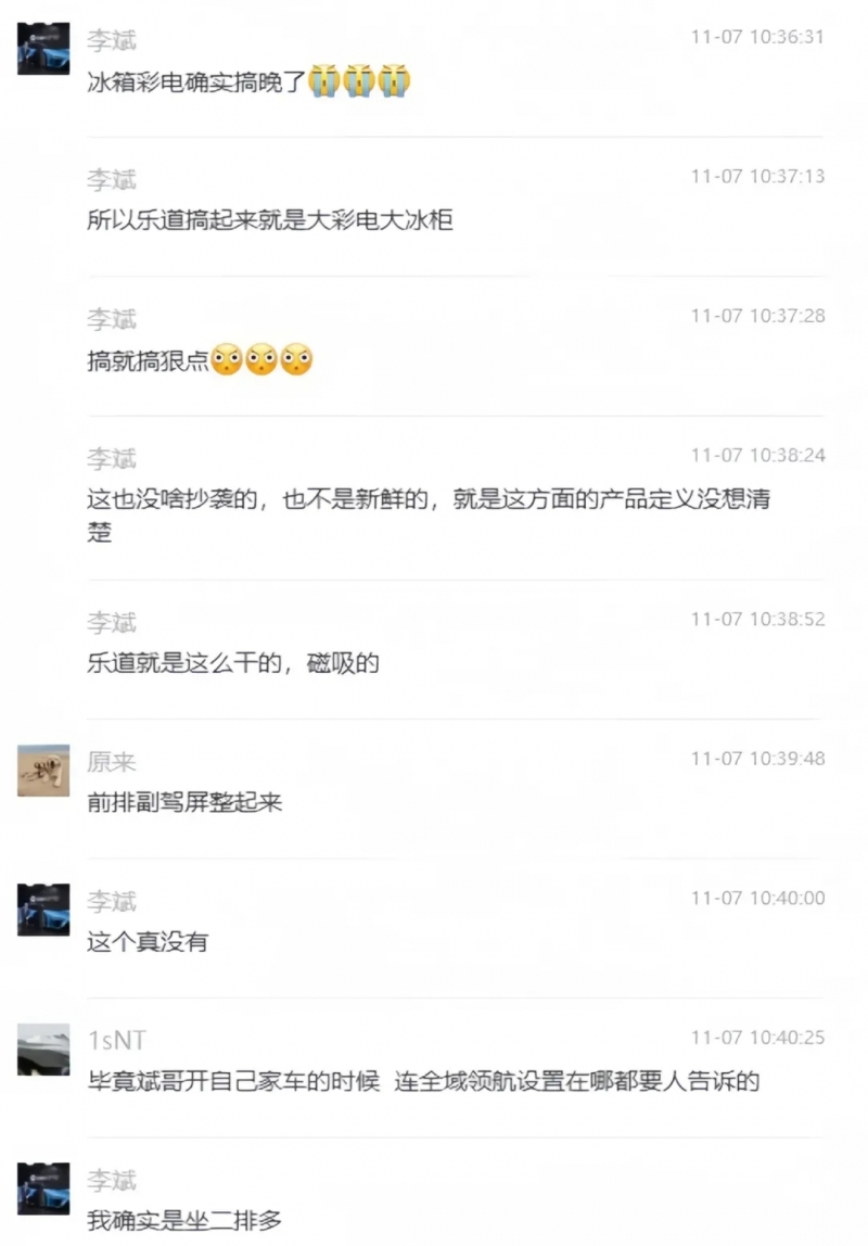 - 11月7日,有媒體發布消息稱,蔚來汽車董事長李斌在一段曝光的聊天記錄中,談到樂道品牌及其首秀車型L60的配置細節。 李斌透露,樂道L60在設計理念上積極擁抱了“大彩電大冰柜”的
