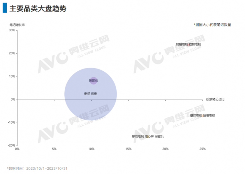 - 2023年雙十一黑電在小紅書的投放競爭差異較大。從電視整體投放來看,站內筆記量很多,然筆記量漲勢變緩。本次主要攫取三款適用于用戶不同需求的電視品類進行分析,即轉軸類電視、壁掛類電視