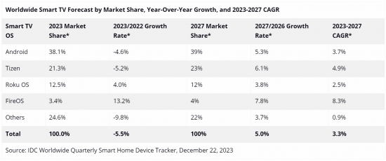 - IDC全球季度智能家居設備跟蹤數據顯示,2023年全球智能電視出貨量將同比下降5.5%。預計2024年增長持平,并在隨后幾年緩慢復蘇。在2023-2027年預測期間,全球出貨量預計將實現3.3%的復合年增