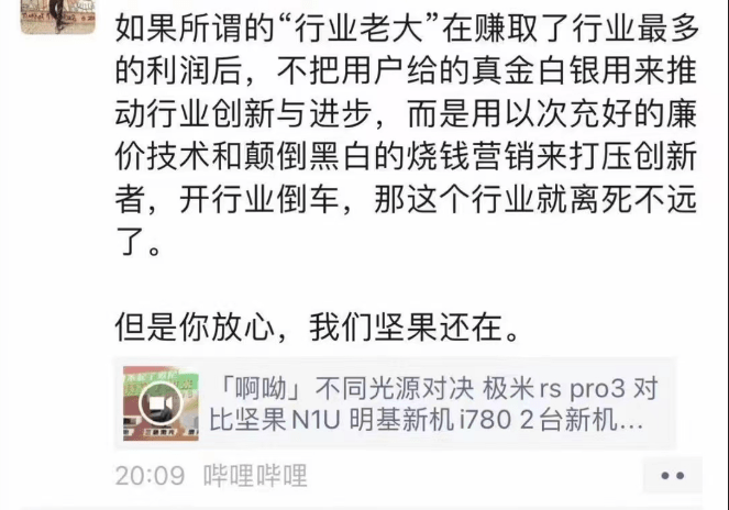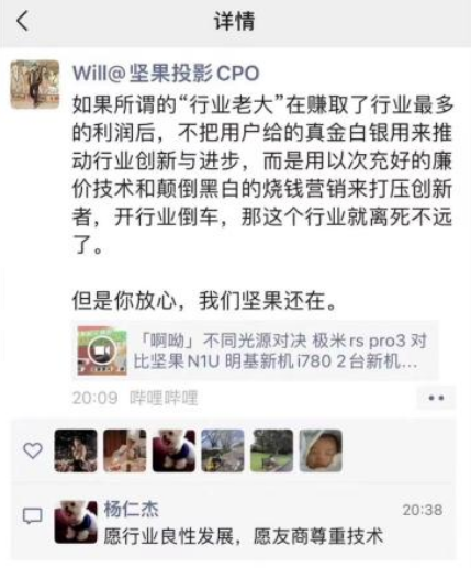- 近日,投影儀圈的兩家知名企業(yè)堅(jiān)果投影和極米科技互撕引發(fā)關(guān)注。 首先是堅(jiān)果投影CPO(首席產(chǎn)品官)Will在朋友圈發(fā)文,怒斥極米科技“開(kāi)行業(yè)倒車(chē)”,極米科技公關(guān)也在朋友圈隔空喊