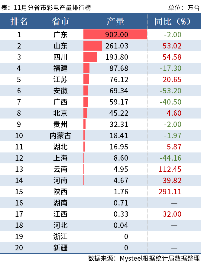 - 統計局:前11月全國分省市家電產量出爐,山東彩電增超26%