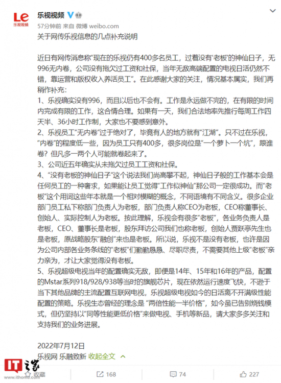 - 近期,微博博主 @Fenng 分享了一個冷知識:樂視居然還剩下 400 多人,有不少是五年以上的老員工。這些老員工稱“幸福感是很多老樂視人留下來的理由”,沒有內卷和 996,沒拖欠過留下來