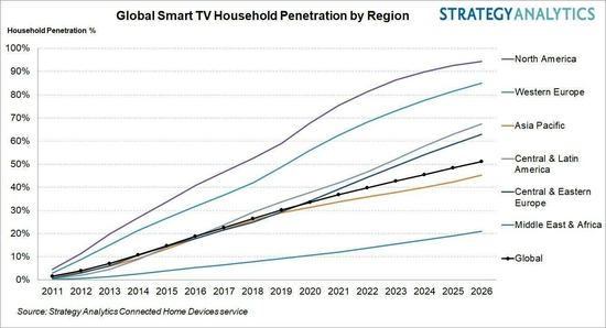 - Strategy Analytics:到2026年全球智能電視家庭擁有量將超過50%