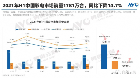 - 2021年上半年,中國彩電市場累計銷量1781萬臺,同比下降14.7%,銷額594億元,同比增長15.1%,均價3332元,同比增長34.9%。彩電零售均價漲幅一度接近50%,直接導致市場銷量自3月起,連續(xù)4個月出現(xiàn)11%-34