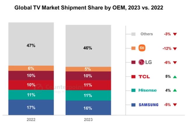 - 今天,市場研究機構Counterpoint Research聯合DSCC共同發布了2023球電視出貨量報告,中韓兩國包攬了出貨量前5的位置。 總體來看,2023年全球電視出貨量達2.23億臺,同比下降了3%。 其中