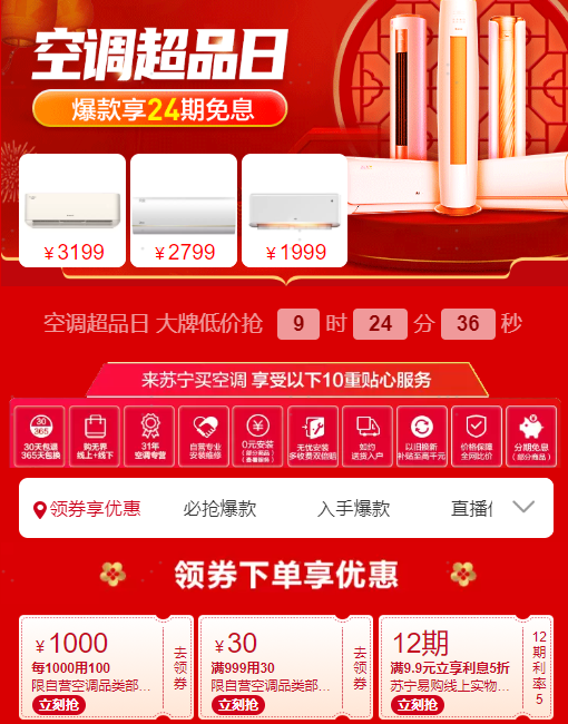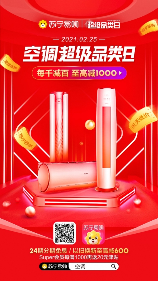 除此之外,2月25日空調超品日當天,還聯合SUPER會員發起會員專屬福利,上蘇寧易購買空調即享受會員價,SUPER會員可享會員津貼紅包、50元專屬延保券,每滿1000元再返20元津貼,可享7款會員專屬價,搶12期分期利率5折券,多重福利來回饋廣大消費者多年來的支持與信賴。