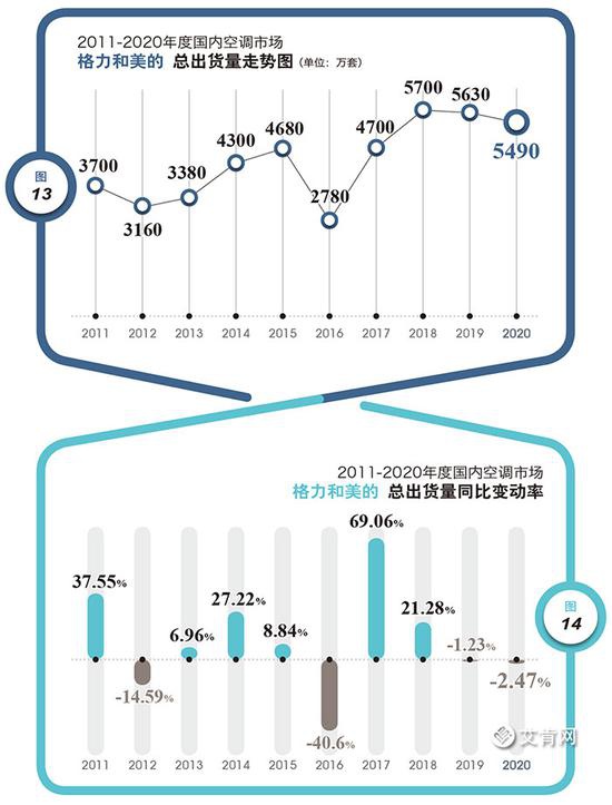 格力和美的總出貨量占比這么多年以來一直穩定在60%左右,十年來的最高峰出現在2015年度,達到了驚人的71.78%,是史上首次也是唯一一次突破70%。當年度國內市場出現了大幅下滑,無論是下滑幅度還是下滑總規模,都超過了2020年度,國內市場的需求資源向格力和美的快速集中。(圖13、圖14、圖15)