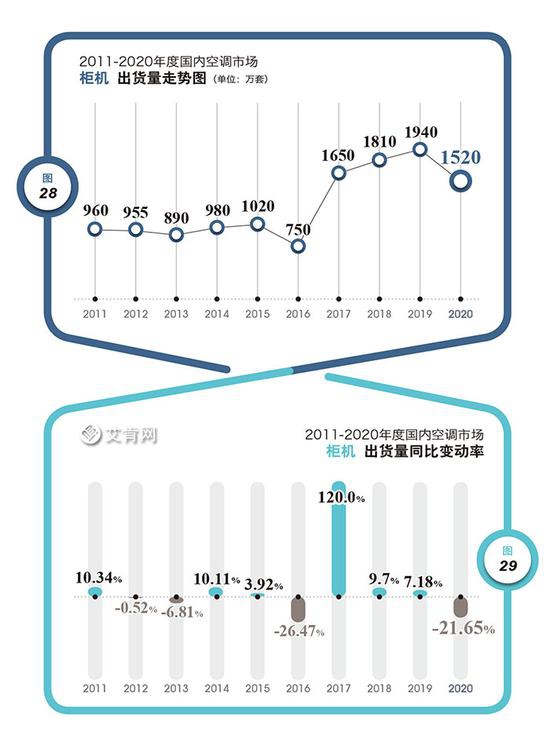 8285萬套的出貨總量是一個很有意思的數字,從2017年度的7900萬套到之后兩年的9000萬套以上的規模,國內市場直接跨越了8000萬套區間,2020年度的8285萬套算是填補了這一空白。但是這一填補多少有點悲情色彩,因為繼2019年度出現了3.37%的下滑之后,2020年度又一次出現了下滑,國內空調市場在過去十年以來第一次出現兩個年度連續同比下滑的態勢。這種狀況在整個產業的發展史上也并不多見。(圖1、圖2)