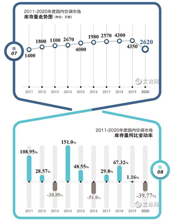 2020年度之前兩個年份國內空調市場的遺留庫存量都在4000萬套以上,這種規模并非是行業內首次出現,更在之前的2015年度也曾經出現過類似的規模,只是,因為新能效等級標準的實施必須對產品布局進行切換,這也使得2020年度在起始之初就背負了去庫存的使命。